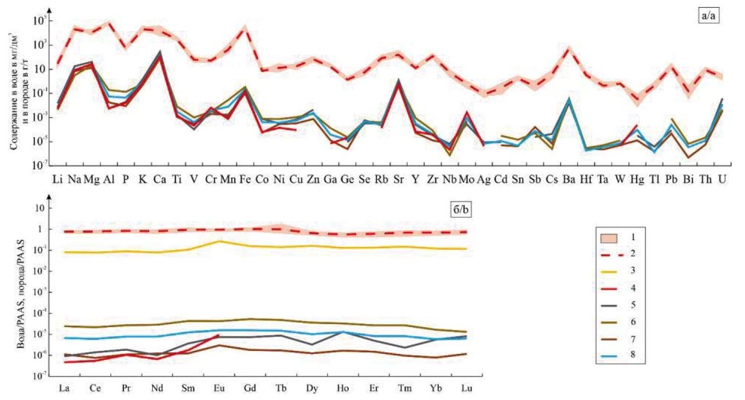 Fig. 5. Distribution spectra of microcomponents (a) and rare earth elements (b) in waters and host rocks. Legend: 1 – clayey shales; 2 – average for clayey shales; 3 – quartz vein; 4 – Zheleznodorozhny spring; 5 – Novolugovoy spring; 6 – Kapustny spring; 7 – Inskie springs; 8 – average for springs