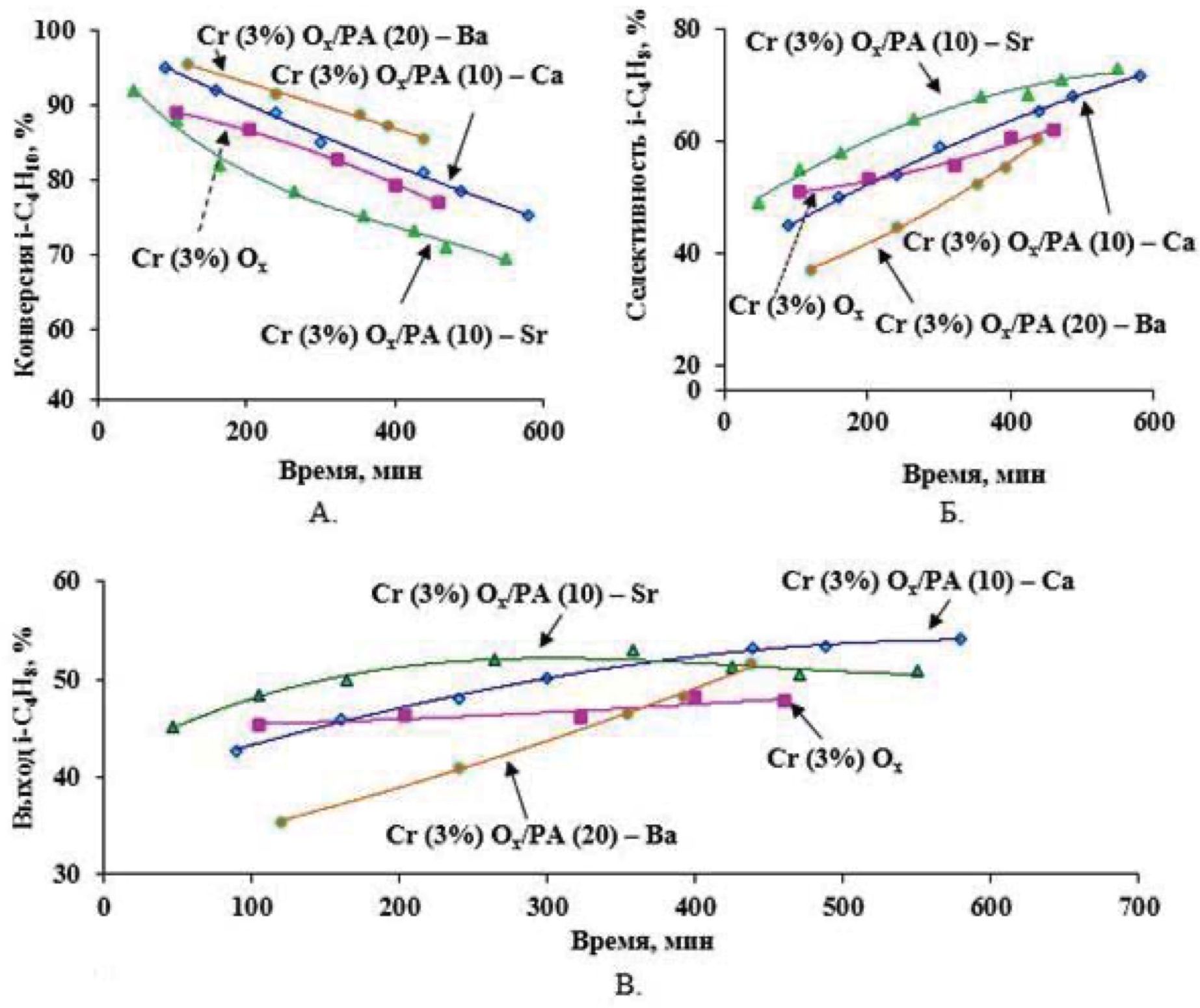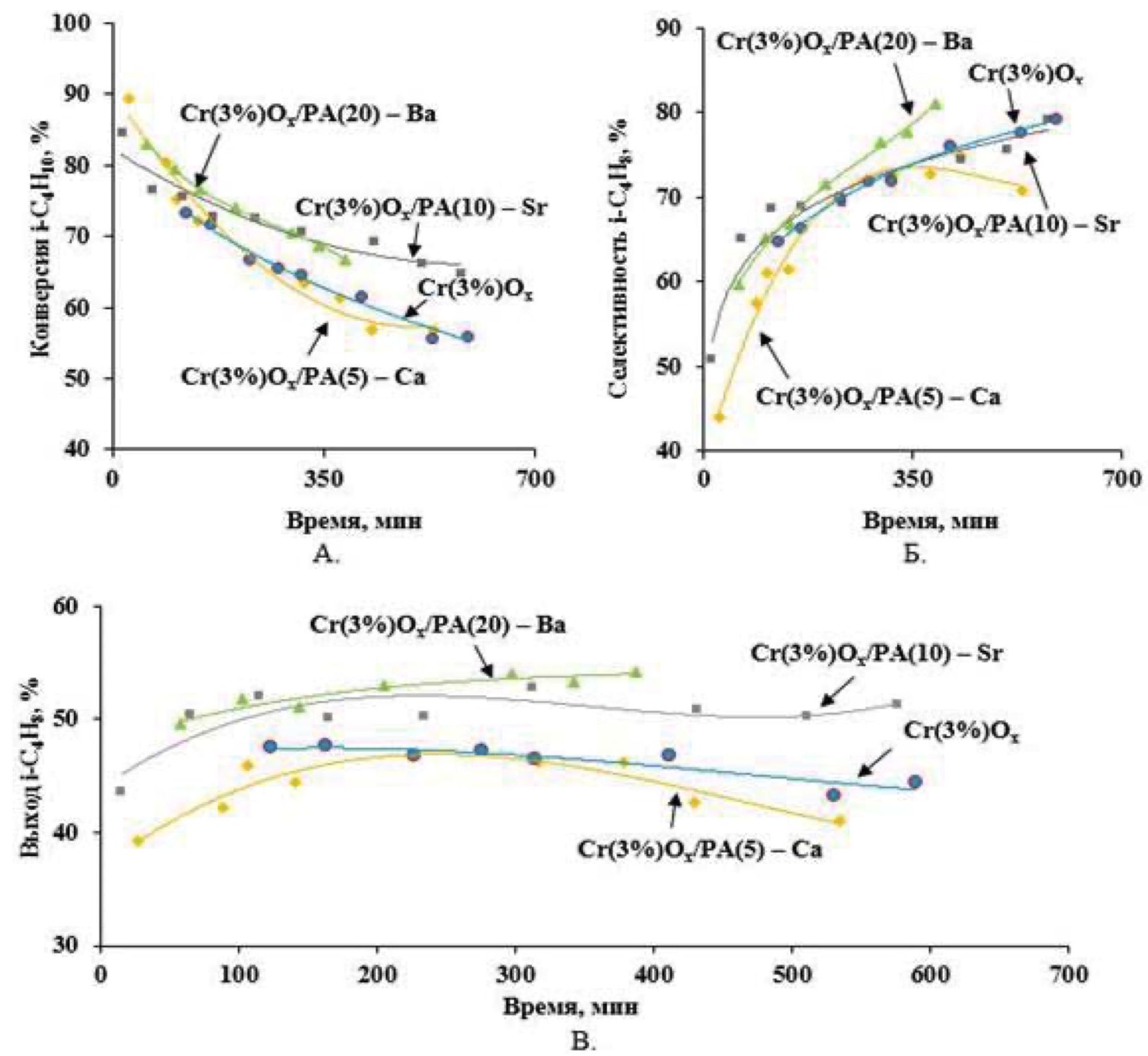 Относительно других образцов барий-промотированный катализатор демонстрирует высокую начальную активность, однако его селективность изначально низка. Селективность, впрочем, быстро растет в ходе эксперимента, и через 7 часов работы выход по целевому продукту становится сравним с лучшими образцами, каковыми являются катализаторы, содержащие кальций и стронций (выход по изобутену выше 50 % (рис. 3, В)).