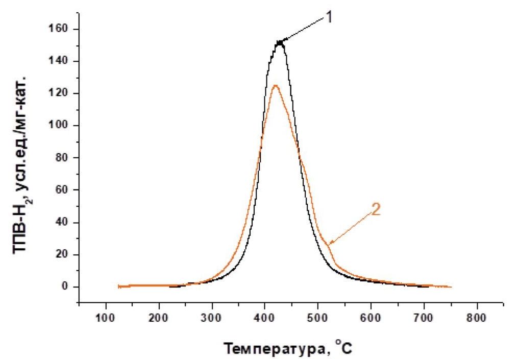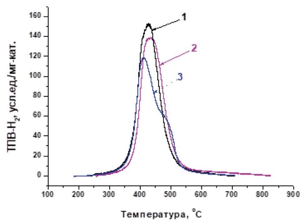 Исследования термопрограмируемого восстановления образцов катализаторов (ТПВ-Н2) проводили на проточной установке, снабженной системой линейного нагрева образцов, соединенной с детектором по теплопроводности. Перед ТПВ-Н2 измерениями образцы обрабатывали в токе сухого гелия при 250 °С в течение 1 ч. Для проведения ТПВ использовали смесь Н2:Ar=10:90 (% об.), скорость подачи смеси составляла 2 л/ч, скорость нагревания – 10–20 °/мин. Перед детектором была установлена ловушка для улавливания воды с температурой около 100 °С.