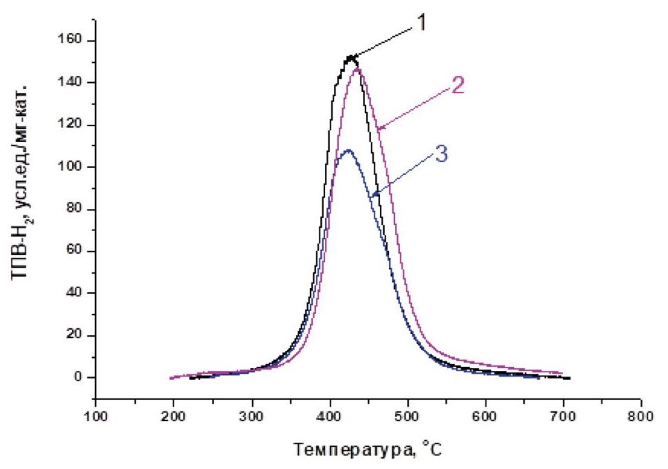 Рис. 4. Кривые ТПВ-H₂ для катализаторов, модифицированных кальцием: 1 – Cr(3 %)Oₓ/КСКГ; 2 – Cr (3 %) Oₓ/РА (5) – Ca/КСКГ; 3 – Cr (3 %) Oₓ/РА (10) – Ca/КСКГ