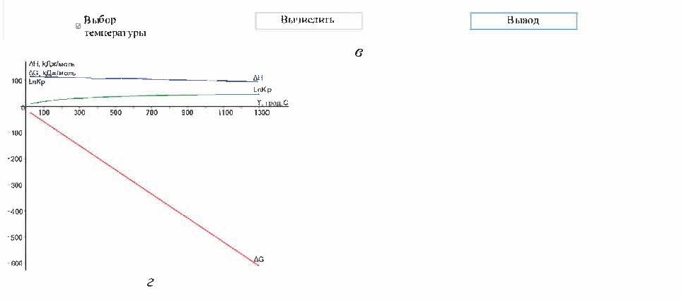 Имеется возможность проводить расчеты для любых температур: например, в интервале от 700 до 705 °С, как показано на рис. 1, в, вычисляются значения потенциалов с шагом 1 °С. Для этого после проведения вычисления при стандартных температурах устанавливается флажок в указателе Выбор температуры (рис. 1, в), вводятся с клавиатуры значения температур в соответствующие поля ЭУ DataGridView, нажимается кнопка Вычислить. Нажатием кнопки Вывод осуществляется экспорт данных из ЭУ DataGridView в файл формата Word. Графики строятся интерполяцией при помощи метода DrawLine в ЭУ PictureBox выбором вкладки «Графики» (рис. 1, г) и выводятся в формате bmp. На рис. 1, г изображены зависимости изменений энтальпии и термодинамического потенциала Гиббса , логарифма константы равновесия для реакции фторирования кварца SiO2 гидродифторидом аммония NH4HF2.