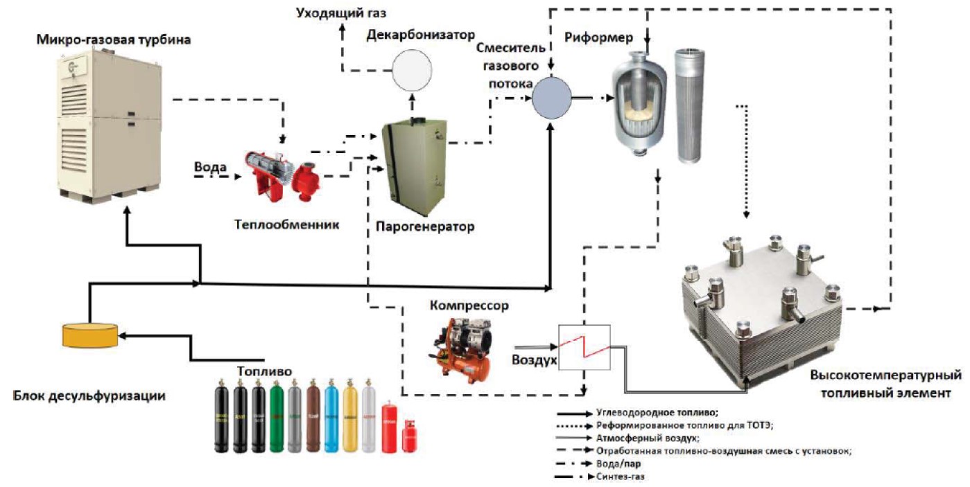 На первом этапе топливо проходит очистку от соединений серы с помощью метода адсорбции. Остаточное содержание соединений серы в топливном газе после адсорбционной очистки данным материалом не превышает в среднем 2 мг/м3 (1,5 ppm) и соответствует требованиям ГОСТ для газообразного топлива энергетических установок. После сорбции топливный газ подвергается предварительному риформингу. После риформирования топливо поступает в анодный отсек топливного элемента. Повышение давления атмосферного воздуха происходит в компрессоре, далее поднимают температуру до рабочих параметров в теплообменнике, и подогретый воздух под давлением направляется в катодный отсек топливного элемента. Далее происходит электрохимическая реакция с образованием электрического тока в преобразователь на блок силовой электроники. В топливном элементе электрохимически преобразуется не все подаваемое топливо (60–80 %). Рециркулирующие анодные газы с высокой температурой с помощью эжектирующего устройства вместе с топливной смесью подаются в прериформер. Оставшаяся часть рециркулирующих анодных газов подогревает топливо и направляется далее на подогрев риформера, где смешивается или сжигается с выходящими горячими катодными газами топливного элемента. После переработки в риформере газы, составляющие обедненную смесь топлива и воздуха, направляются к теплообменнику для нагрева воздуха. Затем они проходят через парогенератор для прериформера. Далее газы передаются в микрогазовую турбину через эжектирующее устройство или используются для нагрева топлива в микрогазовой турбине, в зависимости от рабочих условий [19].