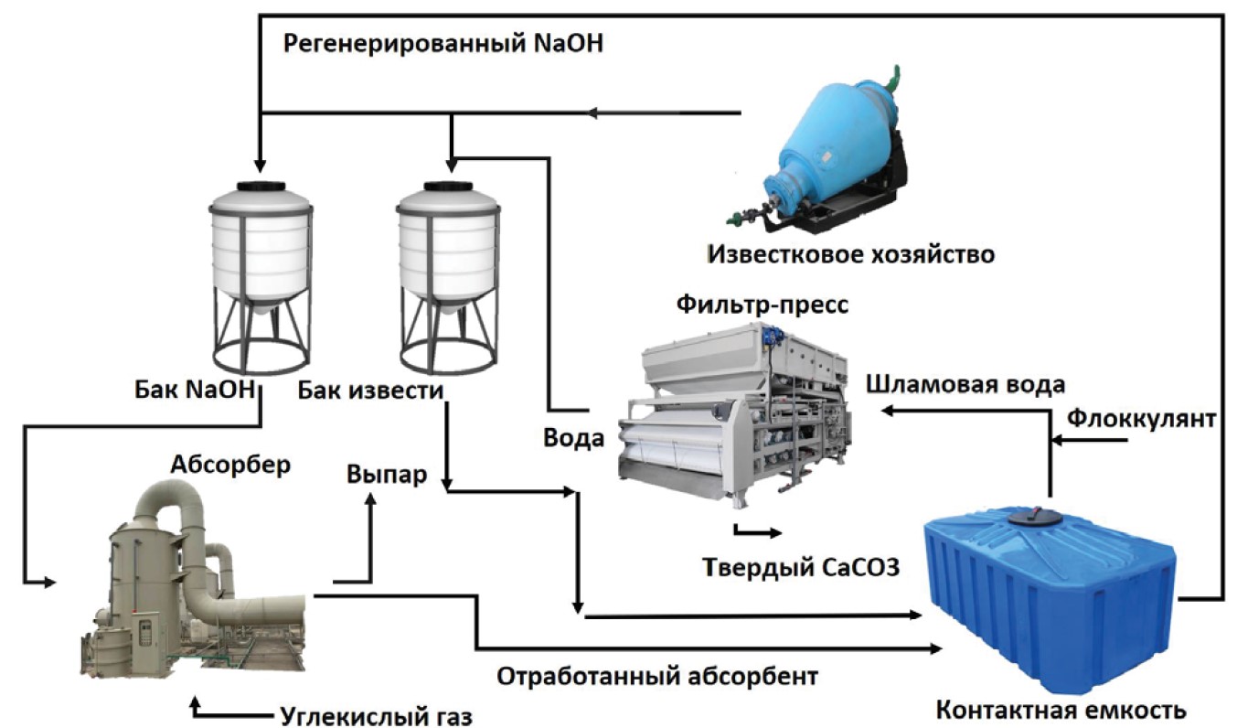 В блоке по улавливанию и утилизации углекислого газа в качестве абсорбента используется 6 % раствор NaOH. Технологическая схема включает абсорбер для проведения процесса утилизации углекислого газа и контактную емкость для отделения образовавшихся продуктов утилизации и регенерированного раствора NaOH. В фильтр-прессе производится обезвоживание шламовой воды, которая отправляется на абсорбер для повторного использования совместно с регенерированным растворов NaOH из контактной емкости. Все линии, связанные с абсорбером, контактной емкостью и фильтр-прессом, присоединены методом спайки труб, выполненных из химически стойкого материала [20].