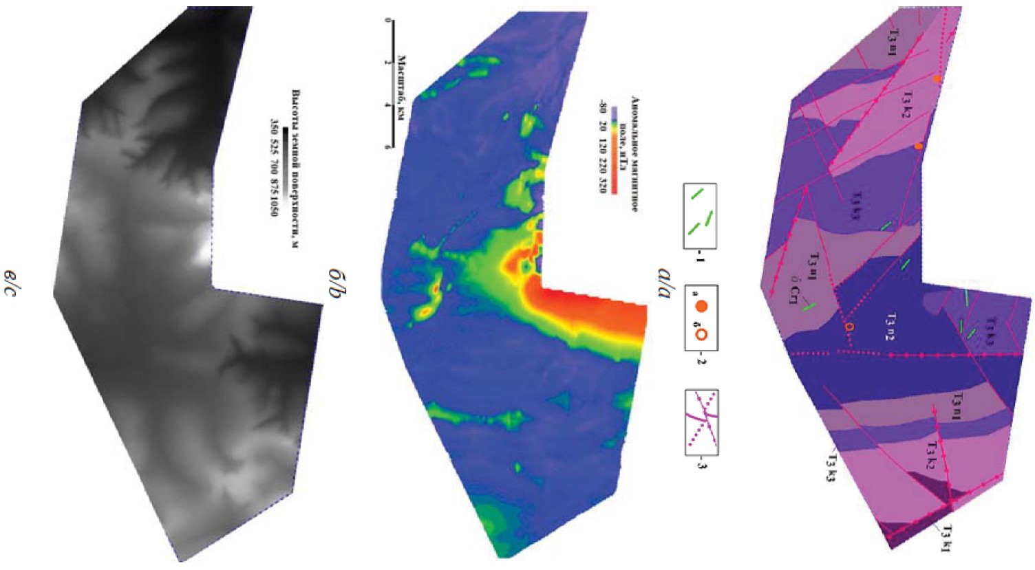 Рис. 1. а) геологическая схема опытного полигона и геополя по данным [21] и с авторской актуализацией; б) аномальное магнитное поле; в) ЦМР. Условные обозначения: 1 – дайки кварцевых диоритов (δCr₁) в поле развития гранитоидного интрузива, 2 – золоторудные эталоны («а» – эндогенные (гидротермальные) рудопроявления; «б» – пункт шлихового опробования с аномальным содержанием золота); 3 – разнопорядковые дизъюнктивы (пунктир – предположительные разрывные нарушения). Структурно-вещественные комплексы: T₃n₁ – верхний триас, норийский ярус, нижний подъярус (алевролиты с прослоями песчаников); T₃n₂ – верхний триас, норийский ярус, нижний подъярус (алевролиты темно-серые, плитчатые и массивные); T₃k₁₋₃ – верхний триас, карнийский ярус (песчаники и алевролиты в различных пропорциях, с прослоями, линзами и иными включениями)