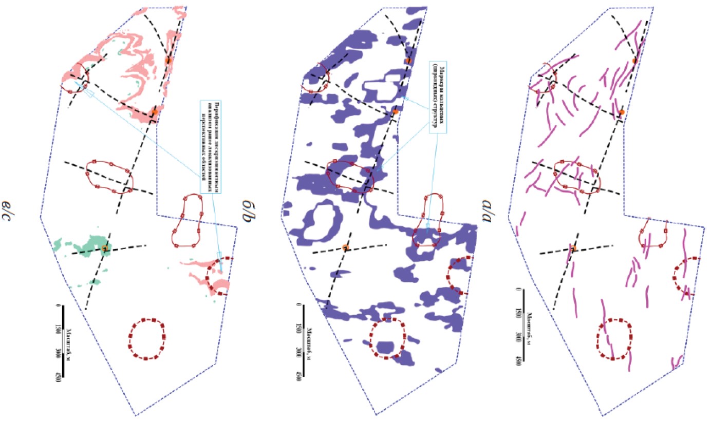 Завершаем наши построения количественной интерпретацией остаточной составляющей магнитного поля: применяем алгоритм в рамках стадий I–IV по получению трехмерного параметрического образа горного массива. Итоговая трехмерная блок-диаграмма горного массива содержит горизонтальный срез на глубине порядка 400 м (рис. 4, а), где проявлено семейство локальных полосовых аномалий узкополосной составляющей (Ta)ост. Часть этих аномалий пространственно совпадает с центральным и западными золоторудными эталонами (рис. 2, Г).
