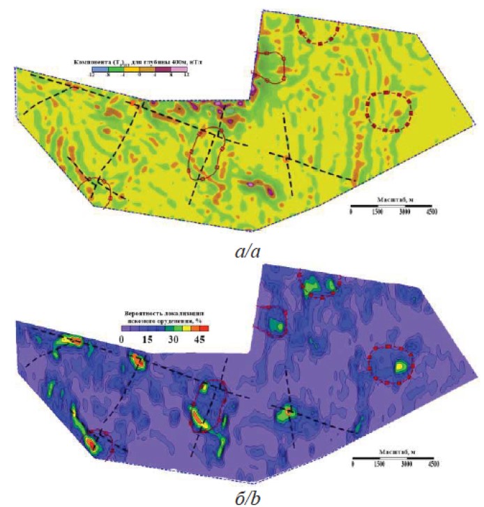 Fig. 4. Verification of the position of local anomalous zones: a) image (Ta)res diagram for a depth of 400 m with localization of a family of band anomalies correlated with gold standards and promising areas identified by the extrapolation method; b) final predictive scheme for the distribution of the probability of detecting objects similar to the reference ones