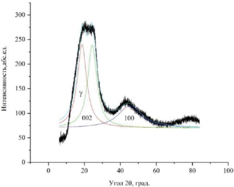 Как видно, дифрактограмма исследуемых А имеет профиль с тремя широкими пиками. Первый пик (γ-полоса) в диапазоне углов 2θ ~19–21° соответствует наличию в наноагрегатах А насыщенных (нафтеновых и/или ациклических) структур, второй пик (002-полоса) в диапазоне углов 2θ ~25–26° соответствует наличию кристаллоподобных пачечных образований, третий пик (100-полоса) в диапазоне углов 2θ ~40–45° относится к плоской структуре ароматических листов в наноагрегатах макромолекул А [25].