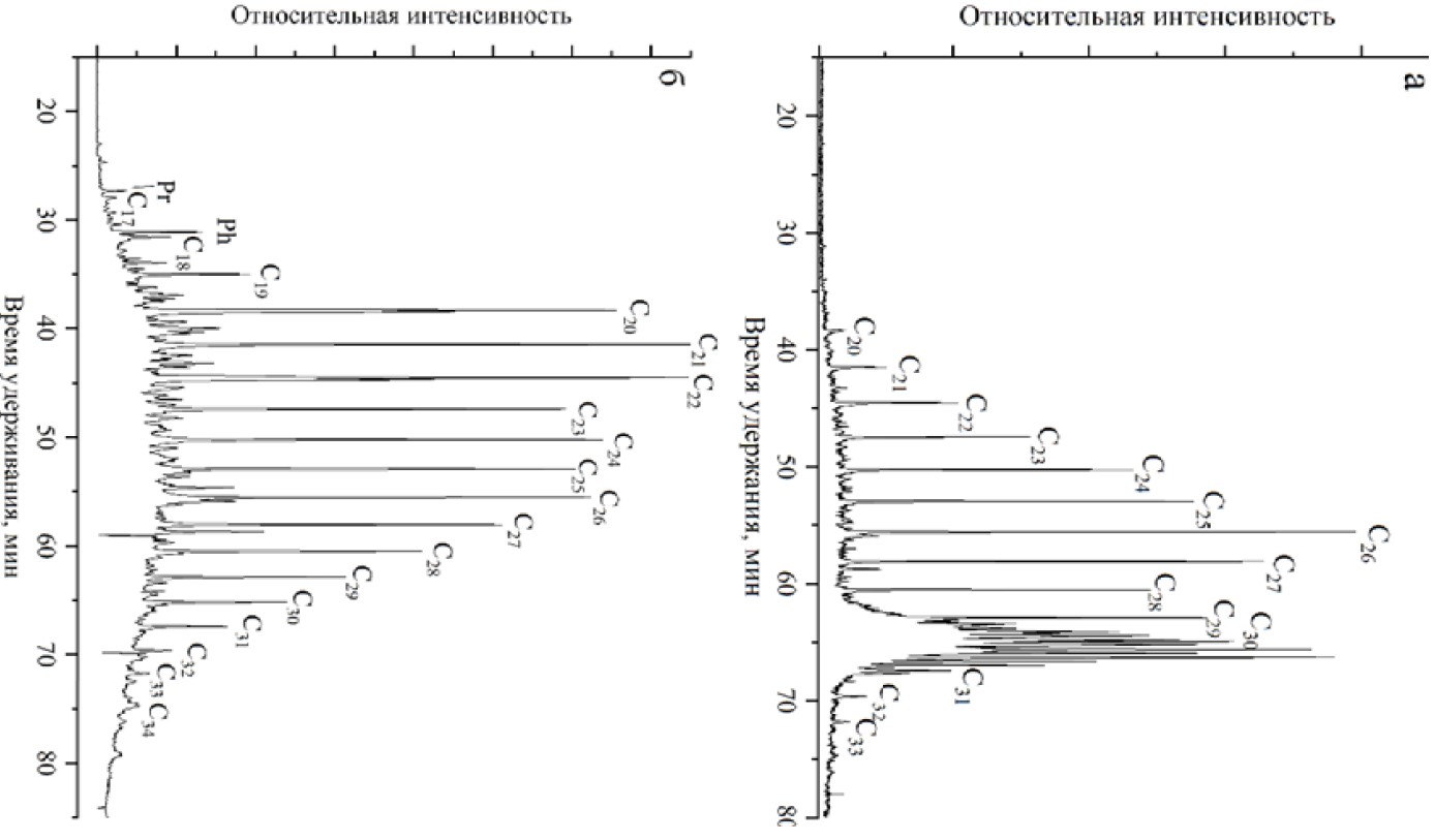 в составе масел мазута идентифицированы н-алканы, н-алкилциклогексаны, гопаны, стераны, н-алкилбензолы, н-алкилметилбензолы, алкилнафталины и алкилфенантрены. Отсутствие в составе насыщенных углеводородов низкомолекулярных гомологов частично может быть связано с термическим разрушением слабых ковалентных связей в структуре высокомолекулярных компонентов нефти и, как следствие, с отщеплением низкомолекулярных фрагментов, которые переходят в масла, получаемые при ее первичной перегонке.