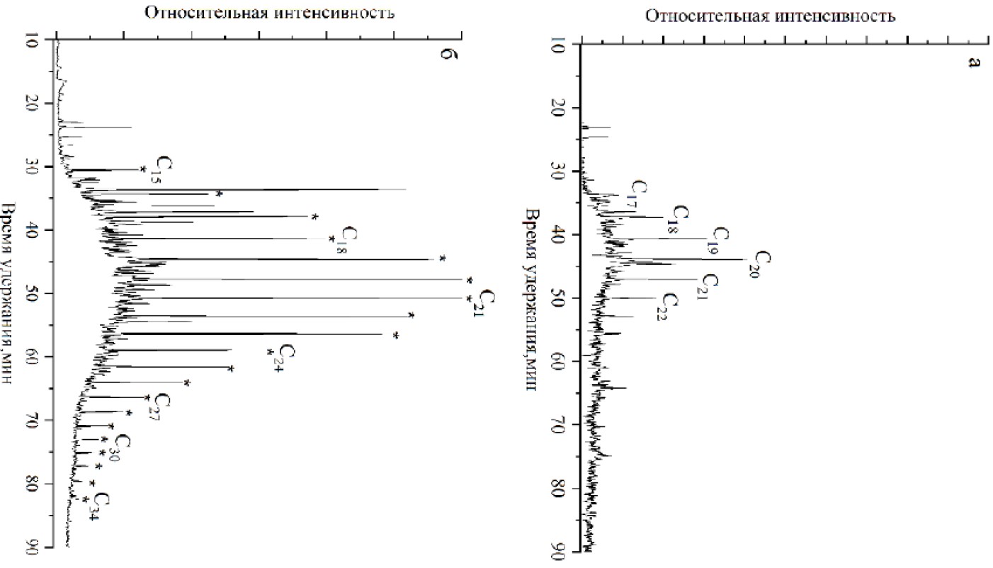 Для анализа С использовали ИК-спектроскопию, СГА и химическую деструкцию, для анализа масляных компонентов – метод хромато- и масс-спектрометрии (ГХ-МС), как наиболее информативный метод определения молекулярного состава нефтяных систем [13–15].