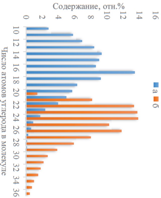 Fig. 6. Molecular weight distribution of n-alkanes in oil (a) and fuel oil (б)