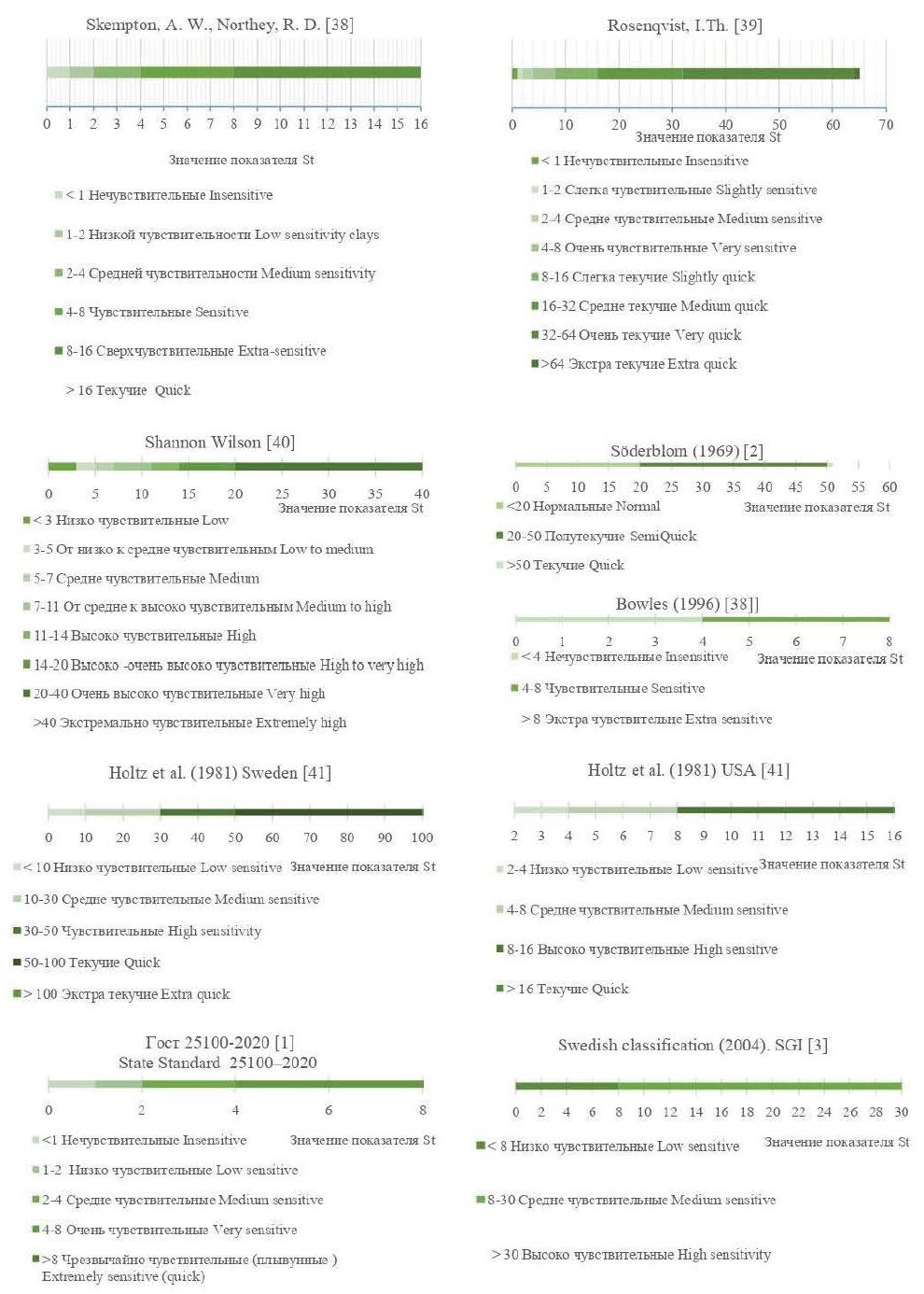 Классификации глин и органических грунтов различаются широким диапазоном чувствительности выделяемых разновидностей (рис. 1). A.W. Skempton с соавторами [38] доказали, что большинство глин, за исключением переуплотненных и содержащих крупнообломочные включения, теряют часть своей прочности при реструктуризации, и предложили свою классификацию по чувствительности. Rosenqvist [39] описал теорию образовании иольдиевых глин при вымывании солей из морских отложений, а позже значительно расширил диапазон значений их классификации [39]. Похожую детальную систематизацию привели W. Shannon и S. Wilson в [40]. R. Holtz сравнил классификацию USA [41], где редко встречаются текучие глины, и шведскую систему, где чувствительные глин типичны. J. Bowles [42] предложил классификацию, в которой грунты нечувствительны при St<4 и чрезвычайно чувствительны при St>8.