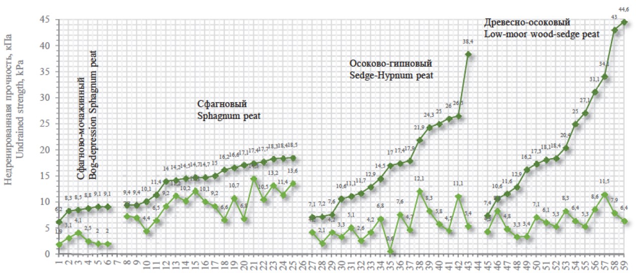 На (рис. 1) приведены графики с размещенной по возрастанию недренированной прочностью торфа с ненарушенной (верхняя кривая) и нарушенной структурой (нижняя кривая): сфагново-мочажинного, сфагнового (представленный пушицево-сфагновым, фускум- и магелланикум-торфами), осоково-гипнового и древесно-осокового видов. На графиках видно, что недренированная прочность грунта с нарушенной структурой с ростом того же показателя в естественном состоянии слабо увеличивается у сфагновых видов или совсем не возрастает у более прочных торфов: древесно-осокового и осоково-гипнового (рис. 2), а также у травяного, осокового и гипнового. Необходимо отметить, что именно эти виды менее склонны к быстрому восстановлению прочности из-за потери внутренних связей при разрушении разложившейся древесины, спутанных как войлок коротких корешков осок и слабых мелких остатков гипновых мхов.