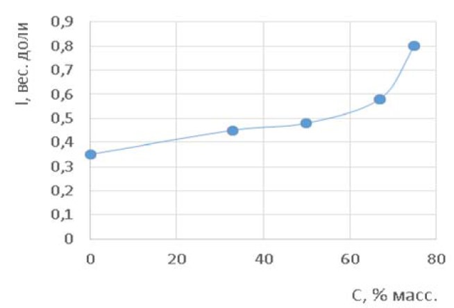 Fig. 4. Effect of the ratio of water to gravel screenings (C, %) on water content (I, wt. h.)