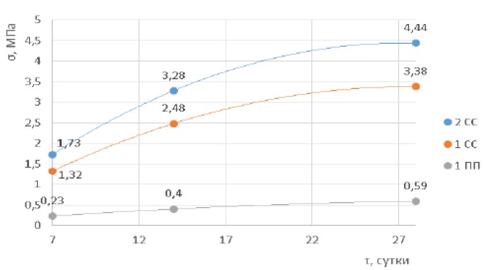 Таким образом, можно констатировать положительную динамику возрастания прочности изделий при увеличении времени перемешивания, которая выравнивается после 5 минут процесса.