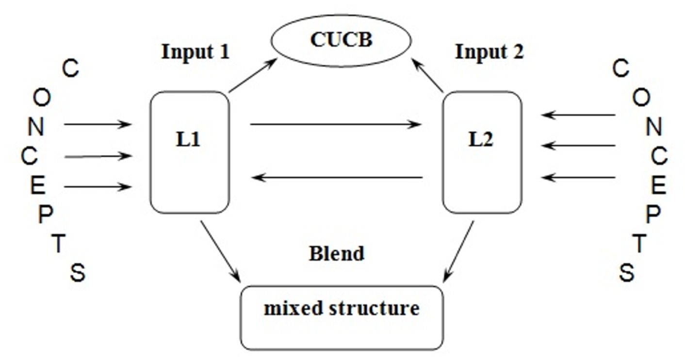 This cognitive operation also serves as the basis for the process of linguistic interference. Having “a common underlying conceptual base (CUCB)”, blending results in forming conceptual and linguistic information that is neither the same as in the native language, nor as in the target one (Kesckes, Albertazzi 2007: 160). Basing on this conception, we have attempted to create a schematic representation of the conceptual integration (Fig. 1), where L1 is a native language, L2 is a target language, and the blend results in the mixed structure, which, depending on the level of bilingualism and interference, can result in simple mistakes, mutual adaptation or creation of a new mixed language.