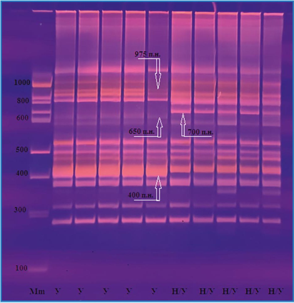 На электрофореграммах видна аллельная разница между изучаемыми контрастными формами капусты белокочанной (рис. 2, 3, 4-я стр. обл.). Размер аллелей устойчивости по локусу PBCESSRJU6 – 142, 191, 370 и 432 п.н., аллеля восприимчивости – 318 п.н, по локусу NI-F02a размер обнаруженных ПЦР-продуктов составляет 400, 650 и 975 п.н. (устойчивые), 700 п.н. (неустойчивые).