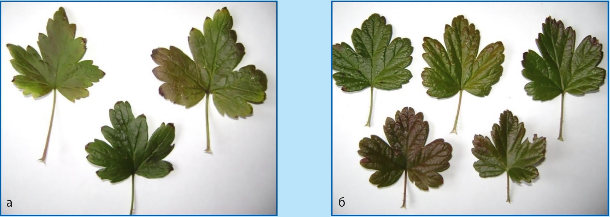 Рис. 1. Состояние листьев у Grossularia robusta (а) и межвидовых гибридов F1, F2 (б), полученных с участием Grossularia robusta (отсутствуют признаки поражения листовыми пятнистостями)