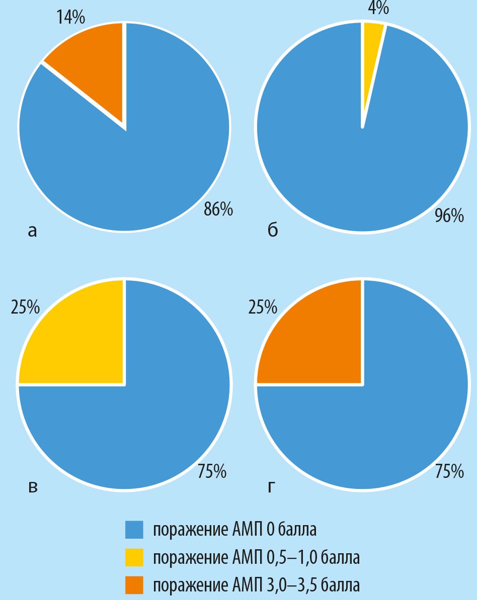 Рис. 3. Процент пораженных АМР сеянцев из гибридных семей в 2021 году: а - 263 (24-14-23 х Grossularia robusta), б - 288 (151-НС-7 х Grossularia robusta), в - 289 (152-х32-23 х Grossularia robusta), г - 282 (152-х32-24 х Grossularia robusta)