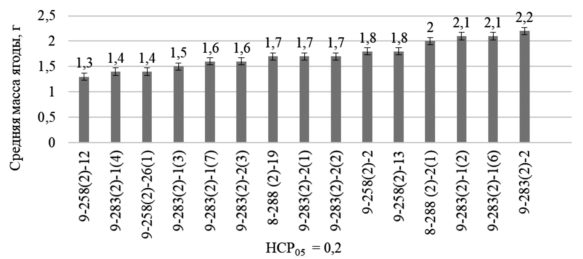 Анализ по массе ягод у гибридного потомства F2, с участием Grossularia robusta показал, что у всех отборных сеянцев было достоверное превышение данного показателя, по сравнению с отцовским родителем, – Grossularia robusta. Средняя масса ягод у большинства сеянцев – 1,3…2,2 г (рис. 4).