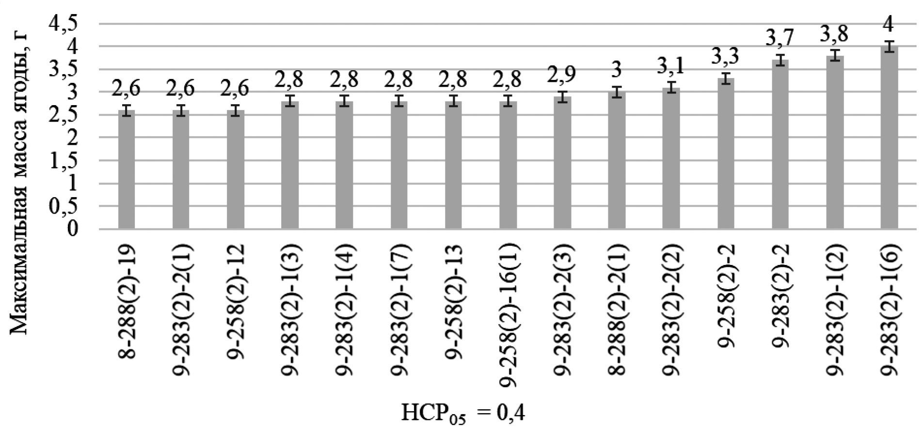 Одно из условий, предъявляемое к сортам крыжовника, пригодных для машинной уборки, – минимальное ограничение по массе ягоды (более 1,2 г). Большая часть отборных форм удовлетворяла этому требованию, а некоторые даже превышали: 8-288(2)-2(1) – 2,0 г, 9-283(2)-1(2), 9-283(2)-1(6) – 2,1 г, 9-283(2)-2 – 2,2 г (рис. 4). Так же в гибридных семьях, полученных от отдаленных скрещиваний с Grossularia robusta, обнаружен значительный потенциал по максимальному выражению признака массы ягоды. У превалирующего числа гибридных сеянцев максимальная масса ягоды колебалась от 2,8 до 3,0 г, минимальное – до 2,6 г у 8-288(2)-19, 9-283(2)-2(1), 9-258(2)-12, максимальное – свыше 3,0 г у 9-258(2)-2, 9-283(2)-2, 9-283(2)-1(2) и 9-283(2)-1(6) (рис. 5).