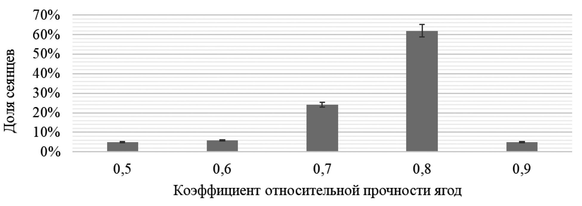 В результате исследований, у большинства отборных форм, полученных с участием Grossularia robusta (более 60% сеянцев), указанный коэффициент имел оптимальный показатель – 0,8 (рис. 7). Некоторые сеянцы (5 и 6% соответственно) имели низкий коэффициент (0,5 и 0,6), то есть они не соответствовали бы условиям машинной уборки. Среди изученных отборных форм у 5% сеянцев максимальный коэффициент относительной прочности ягод – 0,9.