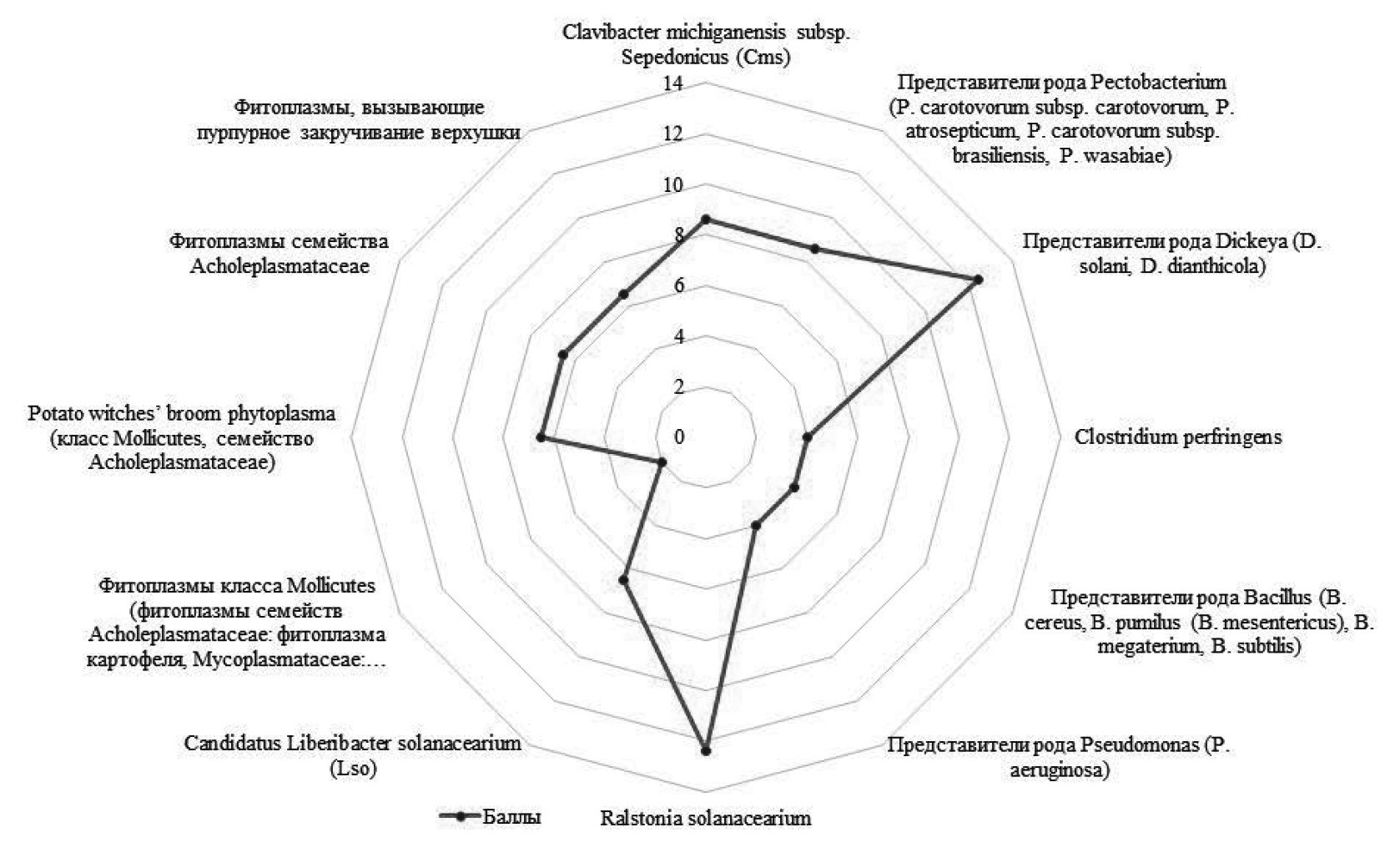 Установлено, что для возбудителей ИПЗК бактериальной этиологии характерны низкий и средний (33,3%) уровни риска по параметрам механизмов и путей передачи, очень высокий (16,7%) встречается значительно реже. При этом средний уровень риска в основном находят у фитоплазм, высокий и очень высокий – у видоспецифичных фитопатогенов, вызывающих различные виды гнилей, в том числе у возбудителя бурой гнили картофеля (Ralstonia solanacearium, на территории нашей страны распространен низкотемпературный штамм R2b3), который считается карантинным объектом. Средний балл по группе составляет 6,8, что соответствует среднему уровню риска.