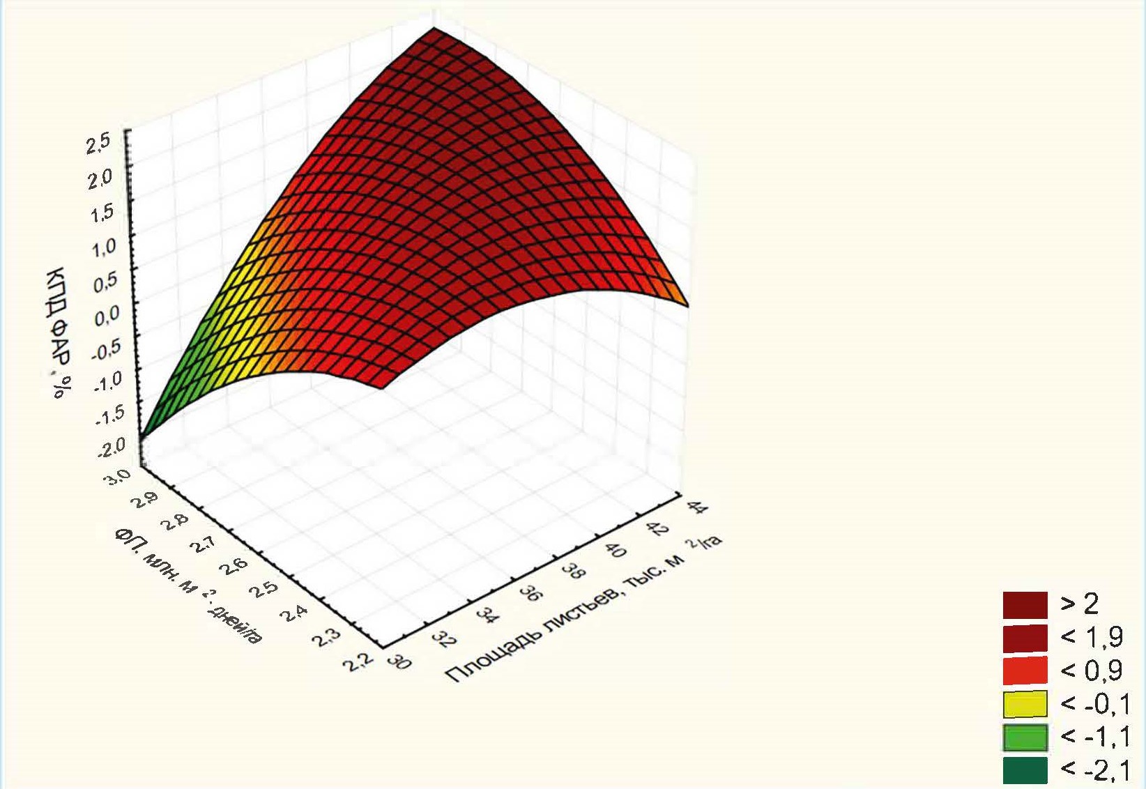 Полученная зависимость между КПД ФАР и изучаемыми показателями позволяет определить значения КПД ФАР при переменных значениях площади листовой поверхности и ФП. Максимальный КПД ФАР может быть при площади листьев 44 тыс. м²/га и ФП – 3,0 млн м²·дн./га.
