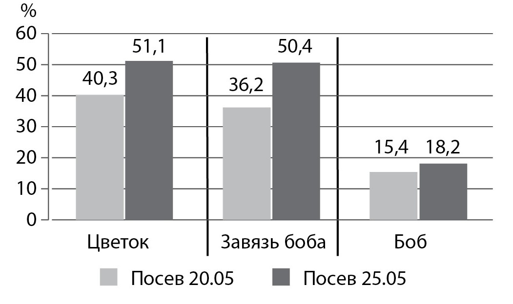 Влияние образовавшихся бобов на продуктивность растений было слабым при посеве 20 мая – 24%, 25 мая – 42%. Срок посева 20 мая был более благоприятен для формирования большего количества семян на растениях.