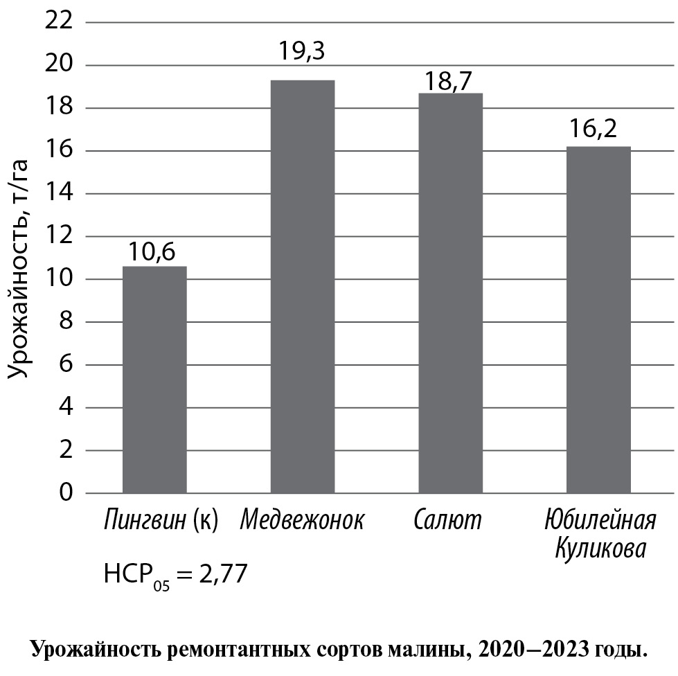 Урожайность ремонтантных сортов малины, 2020–2023 годы