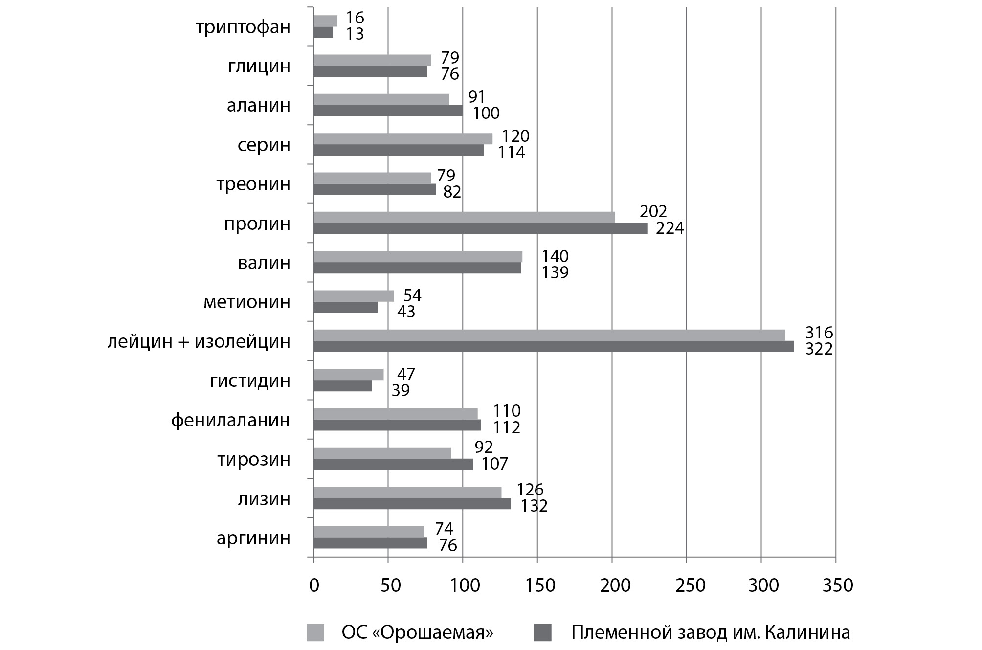 Тирозина, пролина, лейцина, аланина было больше в молоке коров на племзаводе имени Калинина, гистидина, серина, метионина – ОС «Орошаемая».