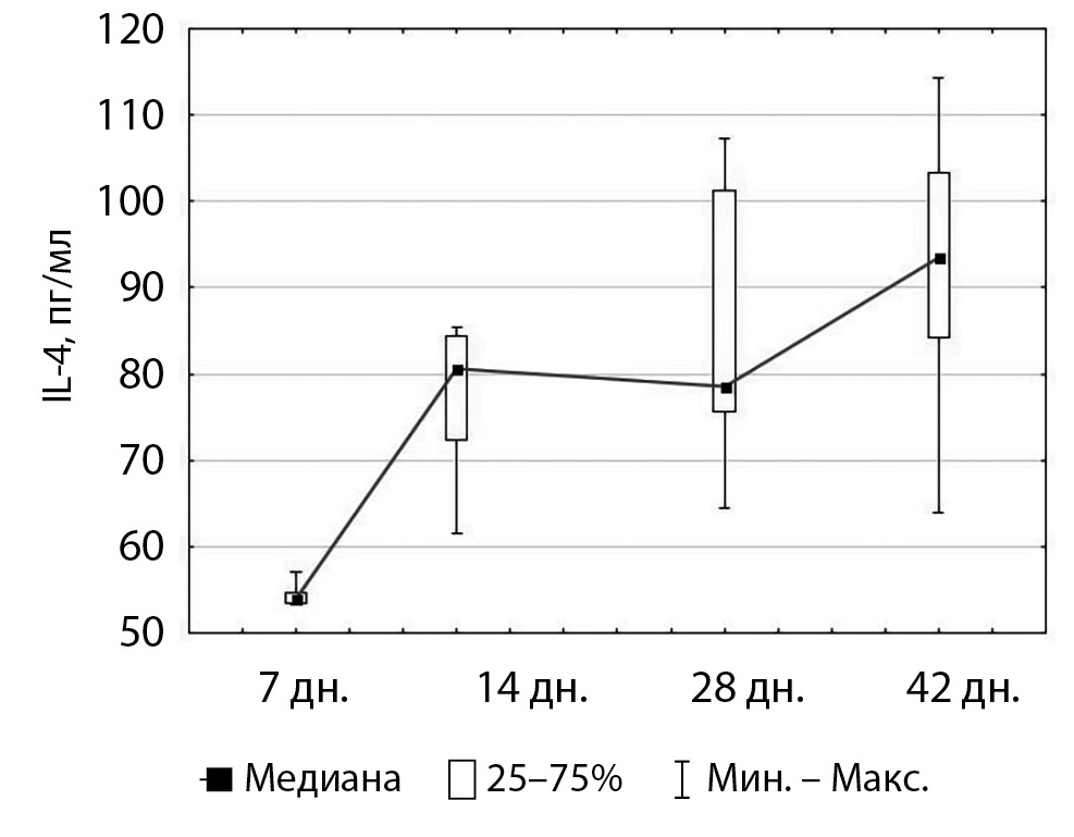 Установлено, что до 14-суточного возраста у цыплят-бройлеров динамика нарастания уровня IL-4 в сыворотке крови была относительно стабильной. Но при рассмотрении содержания IL-4 выявили нестабильные изменения – повышение сывороточного количества IL-4 на 14 сутки физиологического развития бройлеров чередовалось снижением данного показателя к 28 дню развития, которое, в свою очередь, сменялось стойким его повышением к 42 суткам (рис. 4).