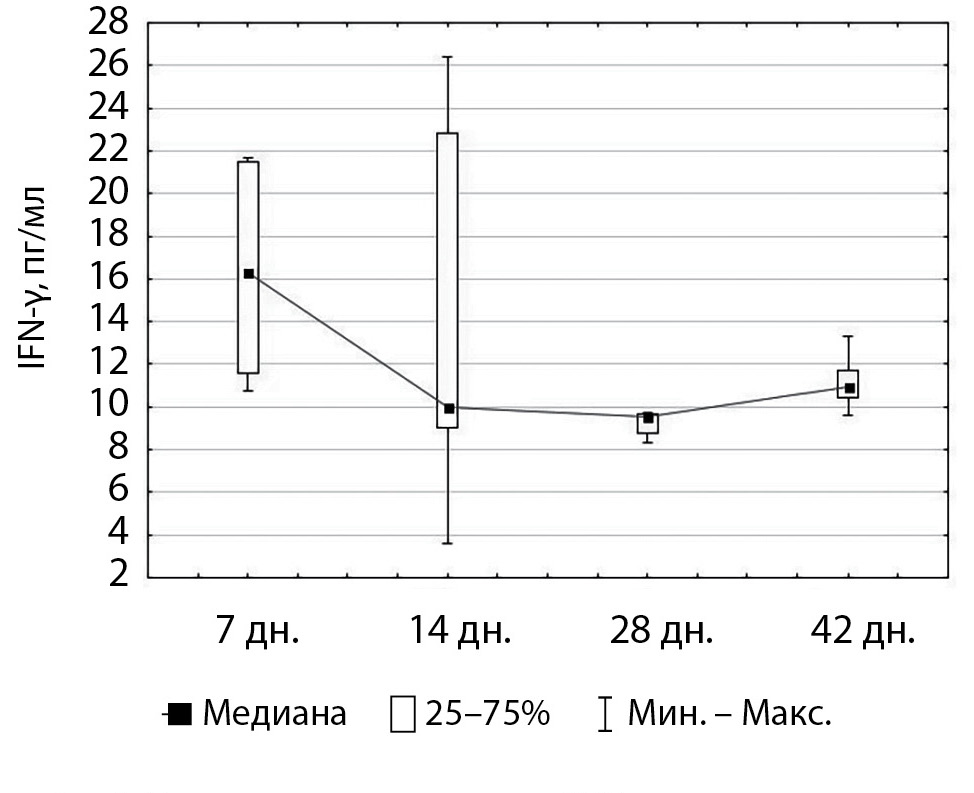Известно, что IFN-γ относится ко II типу интерферонов, регулирующих специфический иммунный ответ и неспецифическую резистентность, стимулирует активность Т- и В-лимфоцитов, совместно с антагонистом IL-4 поддерживает баланс Th1/ Th2. [15]