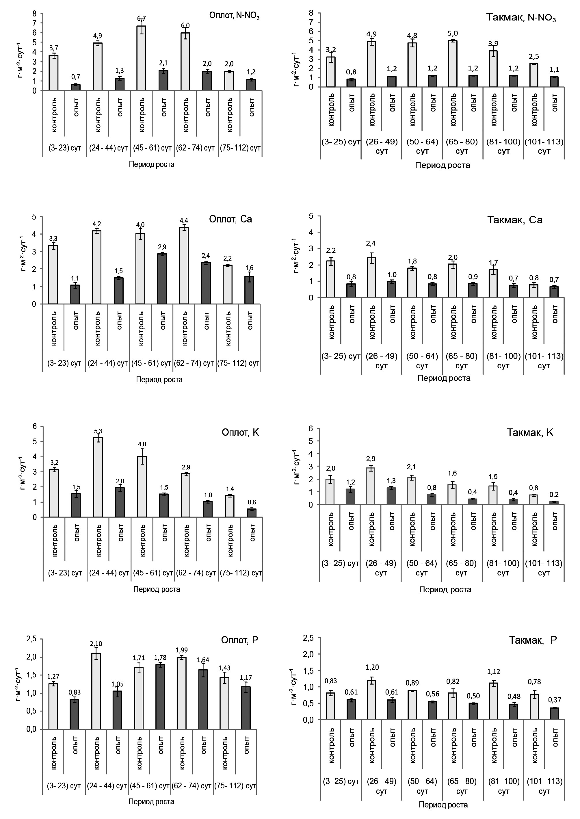 Рис. 1. Поглощение макроэлементов растениями ячменя сортов Оплот и Такмак в процессе роста и развития в зависимости от концентрации N-NO3 в поливном растворе. Над столбиками диаграмм указаны средние значения показателей (то же на рис. 2–7).