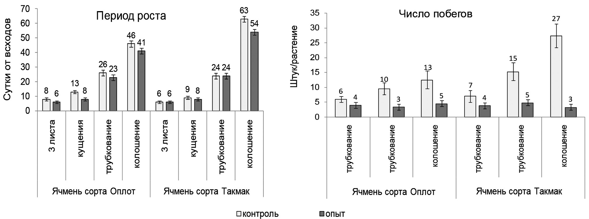К моменту уборки урожая разница в общем кущении между сортами в контрольных вариантах находилась в пределах ошибки, но продуктивное кущение у Оплота было достоверно в 1,4 раза выше, чем у Такмака (td = 3,68 > tst = 2,2 при n = 10 и α ≤ 0,05). Доля продуктивных побегов у Оплота – 49, Такмака – 33%. Масса 1000 зерен у ячменя сорта Оплот больше, чем у сорта Такмак. Масса зерна с колоса главного побега между сортами достоверно не отличалась, но масса зерна, полученная с боковых побегов у Оплота, была почти в 2,3 раза больше, чем у Такмака. В результате Кхоз. и урожай зерна ячменя сорта Оплот оказались в два раза выше, чем у Такмака (табл. 2).