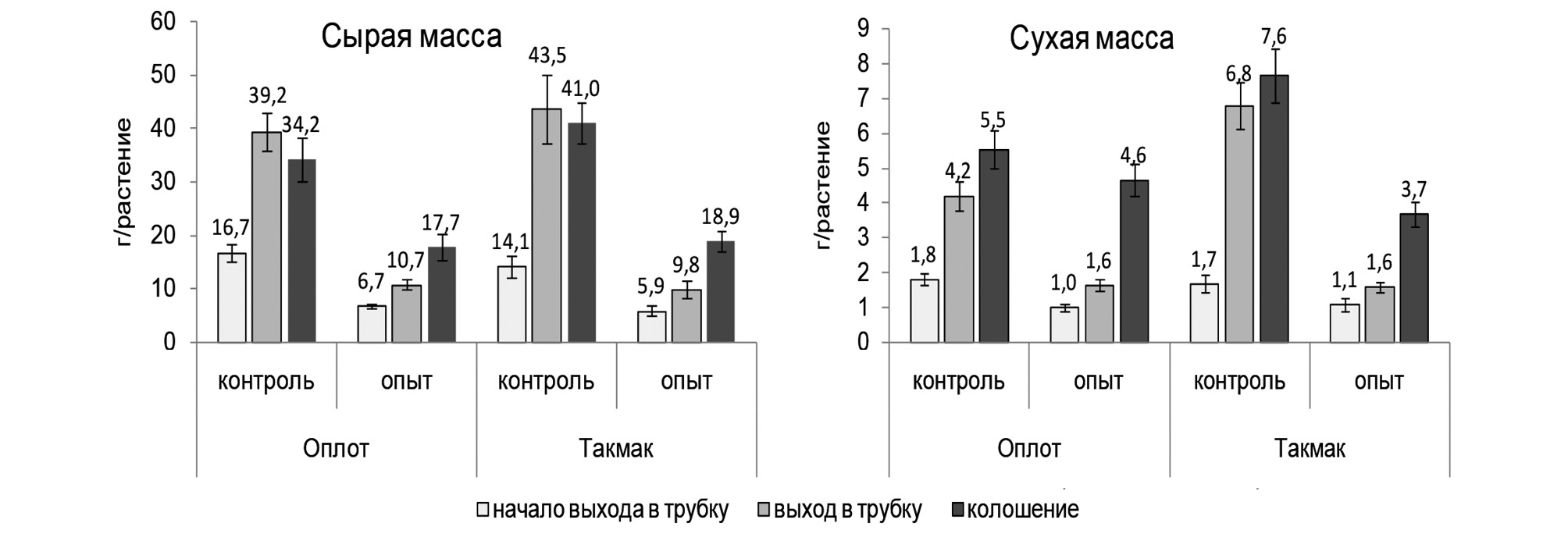 Дефицит N в поливном растворе привел к снижению сырой массы растений обоих сортов, особенно во второй фазе трубкования перед началом колошения: в 3,7 и 4,5 раза у сортов Оплот и Такмак соответственно. Сухие массы растений в этот период уменьшились в 2,6 и 4,3 раза соответственно.
