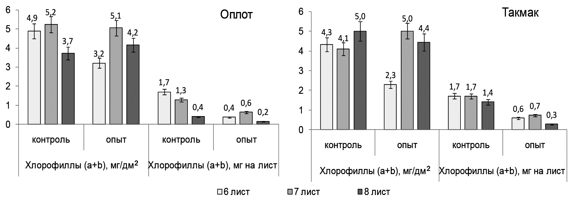 Массы листьев верхнего яруса главного побега растений сорта Оплот, выращенных на растворе Кнопа, меньше чем у Такмака (рис. 4). У Оплота с увеличением ярусности листьев от 6 до 8 от уровня субстрата сырая и сухая масса уменьшалась, при этом у листьев 8 яруса (флаг-листья) в 4,9 и 4,0 раза соответственно оказалась меньше аналогичных масс листьев 6 яруса (рис. 4). У сорта Такмак отличия в сырой массе листьев 6 и 7 ярусов находились в пределах ошибки, 8 яруса (флаг-листья) в 1,9 раза меньше массы листа 6 яруса. Сухие массы листьев 7 и 8 ярусов главного побега у сорта Такмак достоверно от сухой массы листьев 6 яруса не отличались (td = 1,95 < tst= 2,23 при n = 12 и α < 0,05). Характеристика площадей листьев верхнего яруса контрольных растений сортов Оплот и Такмак повторяет закономерности, описанные при сравнении сырых масс соответствующих листьев. Поэтому разница в величине УПП соответствующих листьев у Оплота и Такмака в пределах ошибки эксперимента (рис. 4).