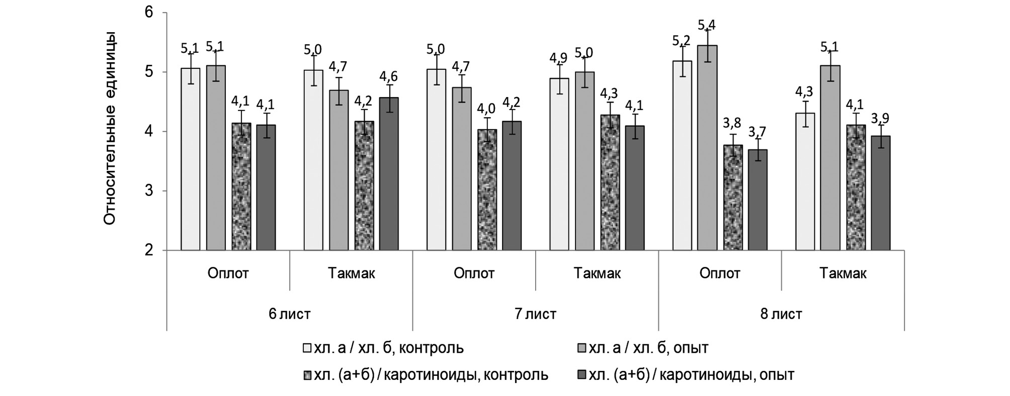 Концентрация хлорофиллов в листьях 6 и 7 ярусов главного побега ячменя сорта Оплот в контроле была несколько выше, чем в контроле у соответствующих листьев сорта Такмак, но в листьях 8 яруса (флаг-лист) концентрация хлорофиллов у Оплота была на 26% ниже, чем у Такмака (рис. 5). Выращивание ячменя на растворах с дефицитом N не повлияло на концентрацию хлорофиллов в листьях двух верхних ярусов, но в листьях 6 яруса сортов Оплот и Такмак наблюдали достоверное снижение их концентрации в 1,5 и 1,9 раза соответственно, по сравнению с контролем (td = 4,3 и 5,2 соответственно > tst = 2,4 при n = 6 и α ≤ 0,05). С учетом меньшей площади листьев в опытных вариантах обоих сортов общее содержание фотосинтетических пигментов в них было меньше, чем в аналогичных листьях соответствующих контрольных вариантов (рис. 5). Дефицит азота не оказал достоверного влияния на соотношение фотосинтетических пигментов в листьях верхнего яруса главных побегов ячменя обоих сортов (рис. 6).