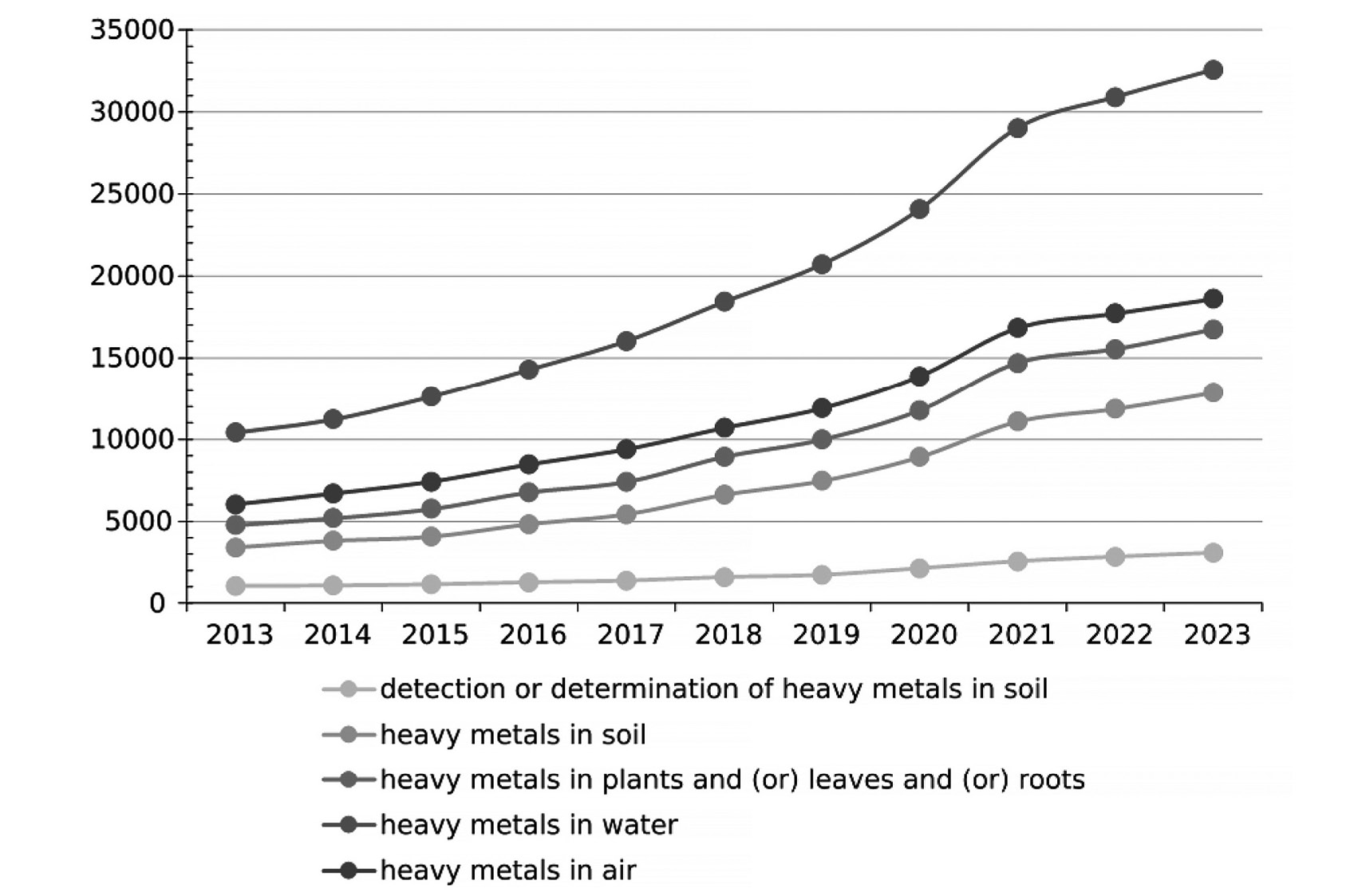 Согласно сведениям базы данных Science Direct by Elsevier с 2013 по 2023 год (дата доступа 05.04.2024) растет количество публикаций об обнаружении тяжелых металлов в различных средах и их влиянии на организмы. Применяли поисковые запросы: 1 – почва: detection or determination of heavy metals in soil и heavy metals in soil; 2 – растения: heavy metals in plants and (or) leaves and (or) roots; 3 – вода: heavy metals in water; 4 – воздух: heavy metals in air (см. рисунок).