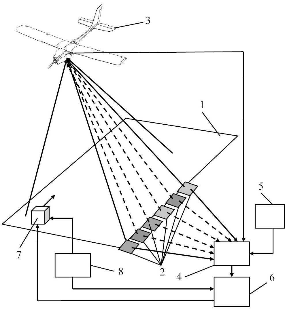 Для получения текущей информации о физических свойствах растений и химическом составе почвы через каждые трое суток отбирают пробы яровой пшеницы, сорных растений и почвы на тестовых площадках с последующей передачей проб в аналитическую лабораторию, чтобы определить их физические параметры. Узнать о состоянии агроценоза на всей площади основного поля можно, используя беспилотный малый летательный аппарат 3, который, совершая пролеты над основным полем и тестовыми площадками с заданной периодичностью, осуществляет их оптическую съемку. Беспилотный малый летательный аппарат оборудуют средствами дистанционного зондирования Земли (ДЗЗ), которые с помощью радиомодемной связи подключают к базе данных 4 вместе с датчиками метеостанции 5. База данных, где хранится описание состояния агроценоза и почвенной среды на тестовых площадках, спектральная информация с основного поля и тестовых площадок соединена с общим управляющим устройством 6, к выходу которого подключен двухканальный исполнительный регулятор 7, а к входу – измеритель пространственных координат 8, установленный на тракторе.