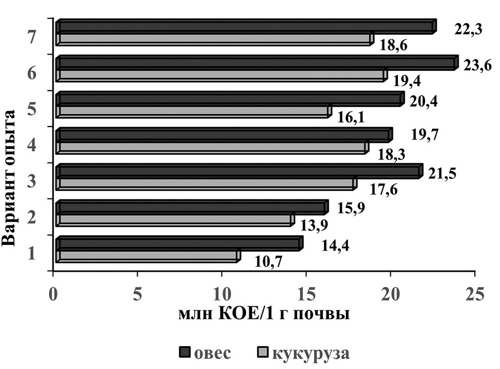 По овсу сохранялась такая же тенденция увеличения биогенности почвы, где активность проявили микробиологические препараты с азотными удобрениями – 23,6 млн КОЕ/г почвы. Действие микробных препаратов (вариант 5) незначительно уступало азотным удобрениям (вариант 3) – на 5,1 и 8,5% варианту применения их с известью и совместному внесению азотных удобрений с Трихоплантом, СК и Биогором-Ж на 13,6%, но на 41,6% превышало контроль. На участке под овсом увеличилась биогенность почвы, по сравнению с почвой под кукурузой из-за преобладания в микробном ценозе микроорганизмов, потребляющих минеральные источники азота (рис. 1).