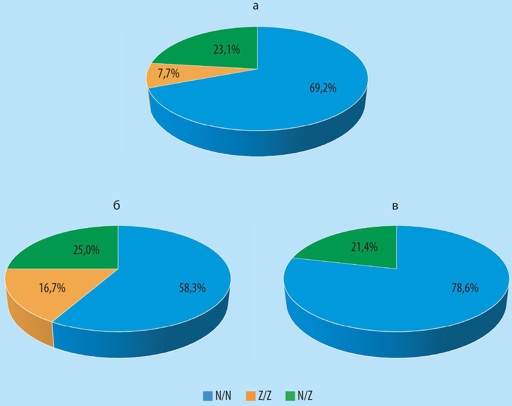 Рис. 6. Частота встречаемости серебристого гена у лошадей советской тяжеловозной породы: а - в фокус-группе; б - у жеребцов; в - у кобыл.