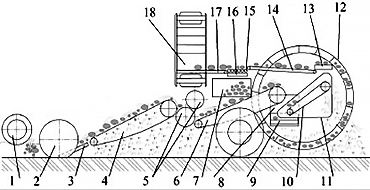 Рис. 1. Конструктивно-технологическая схема комбайна Е–665/4. 1 – катки; 2 – активные вертикальные диски; 3 – лемех; 4, 6 – первый и второй прутковые элеваторы; 5 – баллоны комкодавителя; 7 – бункер; 8, 10 – горки; 9, 13 – элеваторы; 11 – ботвоудаляющий транспортер; 12 – подъемный барабан; 14 – переборочный стол; 15 – сортировка; 16 – элеватор для загрузки бункера; 17 – дополнительный элеватор; 18 – основной выгрузной элеватор.