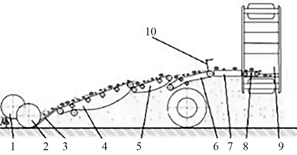 Рис. 2. Конструктивно-технологическая схема комбайна AVR «Esprit». 1 – катки; 2 – вертикальные диски; 3 – лемех; 4, 5, 6 – первый, второй и третий просеивающие элеваторы; 7 – роликовый элеватор; 8 – дополнительный элеватор; 9 – выгрузной элеватор; 10 – гребенчатый ботвоудалитель.