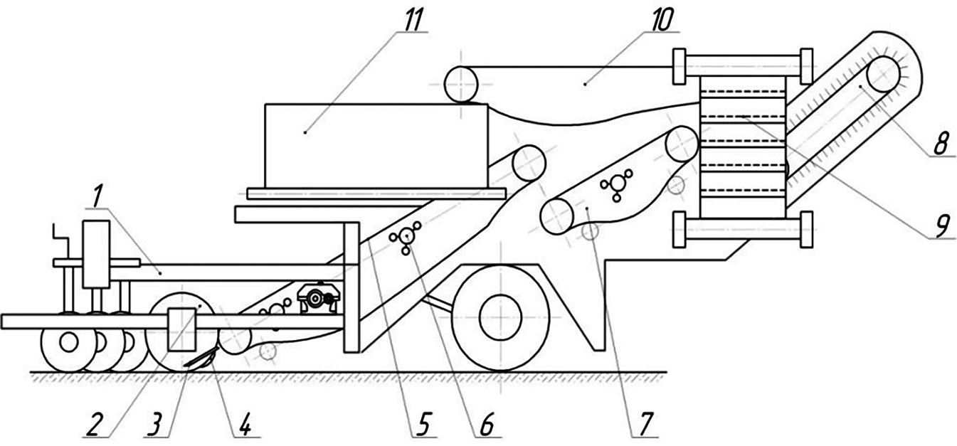Рис. 3. Конструктивно-технологическая схема комбайна AVR-Spirit-6200. 1 – рама; 2 – вертикальные диски; 3 – подкапывающий лемех; 4 – опорное колесо; 5 – основной элеватор; 6 – встряхиватель; 7 – каскадный элеватор; 8 – пальчатая горка; 9 – ковшовый элеватор; 10 – переборочный стол; 11 – бункер.
