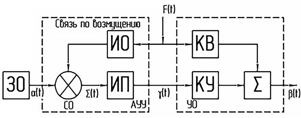 На рисунке 6 показано, что в САУ с принципом управления по возмущению имеется два канала влияния возмущающего воздействия F(t) на управляемую величину γ(t): канал возмущения (КВ) объекта, считающийся естественным каналом влияния возмущающего воздействия, и канал, образованный обратной связью по возмущению усилителем-преобразователем и КУ объекта – искусственно созданный компенсационный канал. [6]