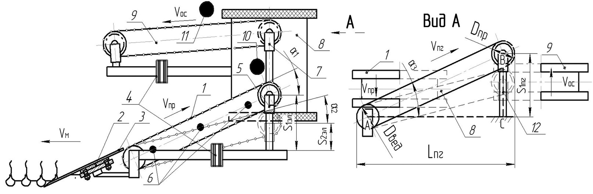 где LПГ – длина выносной пальчатой горки, м; DВЕД – диаметр ведомого вала барабана пальчатой горки, м; DПР – диаметр приводного вала барабана пальчатой горки, м.