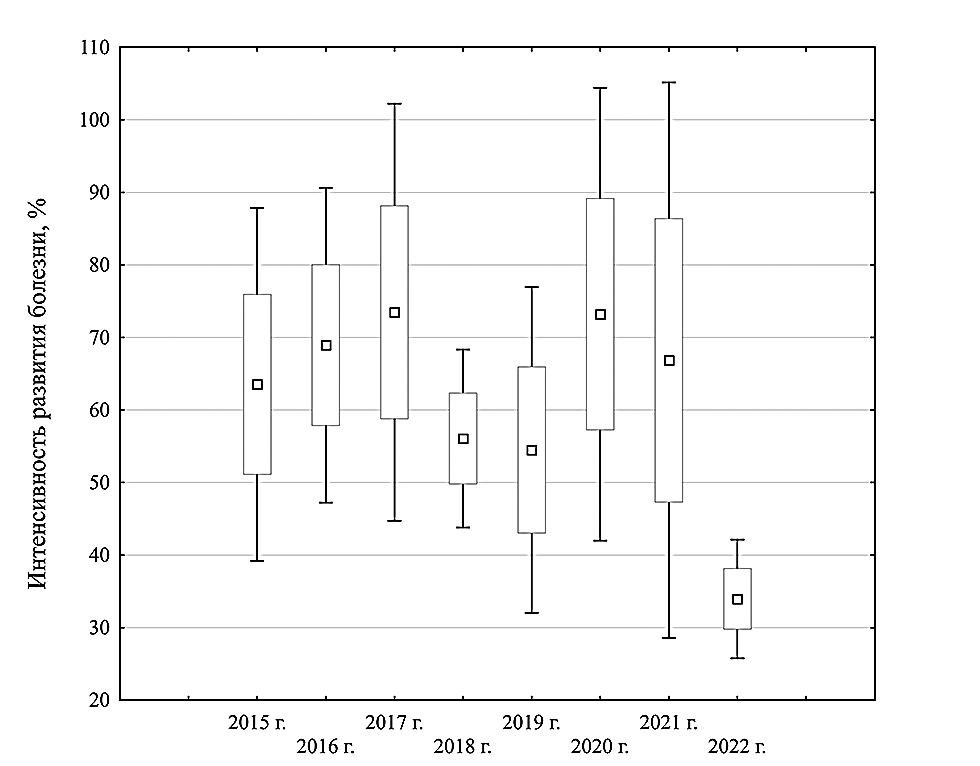 Результаты и обсуждение. Мучнистую росу на растениях яровой тритикале в условиях Дальневосточного региона отмечали в различной степени ежегодно, средняя интенсивность развития заболевания по годам составляла от 34 до 73 % (см. рисунок). Первые симптомы проявлялись в фазе всходов, максимального развития болезнь достигала в межфазный период колошение–цветение.