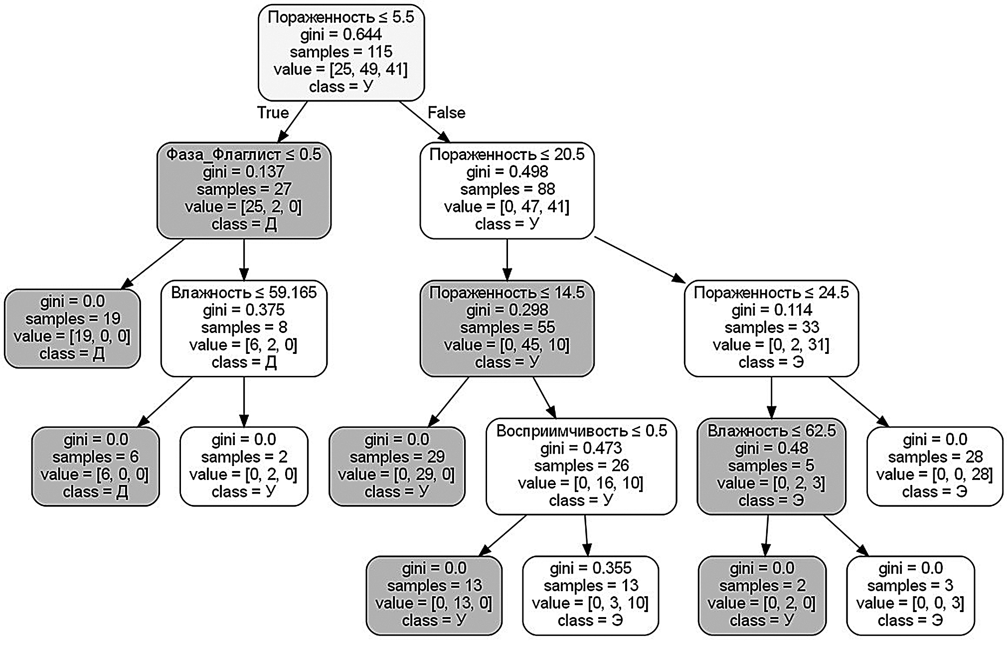 - древовидные алгоритмы предоставляют четкие и интерпретируемые результаты. Это особенно важно для сельского хозяйства, где товаропроизводители должны составлять прогнозы без использования специальных программных средств. При использовании выбранного алгоритма достаточно пройти из корневой вершины к одной из конечных, проверяя соблюдение условий в узлах модели, и получить прогноз развития болезни;