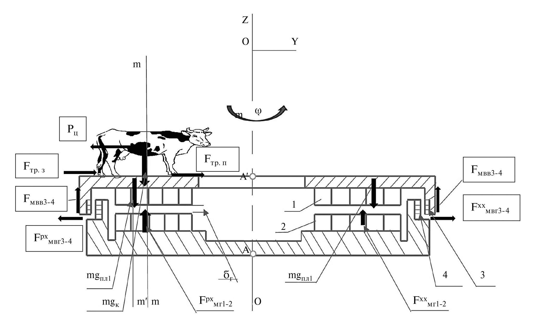 Рис. 2. Cхема cил, действующих на левитирующую доильную платформу Карусели с животными при ее полном заполнении: 1 – подвижная горизонтальная магнитная сборка левитации; 2 – неподвижная горизонтальная магнитная сборка левитации; 3 – подвижная вертикальная магнитная сборка боковой стабилизации; 4 – неподвижная вертикальная магнитная сборка боковой стабилизации; Rпл – радиус платформы, м; ϭг – воздушный левитационный зазор между горизонтальными магнитными сборками, м; ϭв – воздушный левитационный зазор между вертикальными магнитными сборками, м; hцт.к – расстояние от подвижной части платформы до центра тяжести животного по вертикали, м; hпл – высота платформы, м; Lоо-mm – расстояние от оси вращения платформы до центра тяжести животного по вертикали, м; lm-m΄ – расстояние от центра тяжести животного до центра тяжести доильного места платформы по вертикали, м; h мг – расстояние от нижнего основания платформы до боковой вертикальной магнитной сборки (3–4); точка «А» находится на оси вращения платформы О-О.