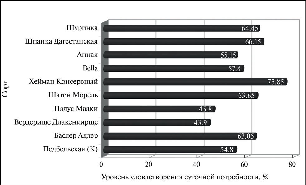 При употреблении 100 г плодов изучаемых сортов вишни удовлетворение суточной потребности организма человека в Р-активных соединениях в зависимости от сорта варьирует от 43,90 (Вердерище Длакенкирще) до 75,85 % (Хейман Консервный). Согласно ГОСТ Р 52349–2005, если содержание функционального ингредиента в продукте составляет не менее 15 % от суточной потребности организма человека, его считают функциональным. В соответствии с этим требованием все исследованные сорта вишни могут считаться функциональными продуктами питания по массовой концентрации в плодах Р-активных соединений (рис. 3).